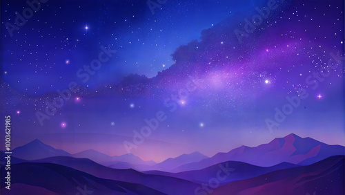 © Arties, Fototapeta premium Purple starry night sky over mountain landscape