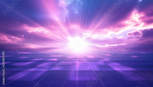 © Adri, Fototapeta premium Purple sunrise over digital horizon, rays, clouds