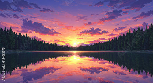 © wiplens, Fototapeta premium Purple Sunset Over Mountain Lake Reflection