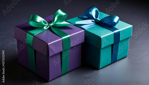 Obraz premium Purple Teal Gift Boxes with Dark Background.