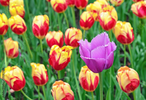 Fototapeta premium Purple terry tulip on the background of yellow-red tulips. Blooming Gesner's...
