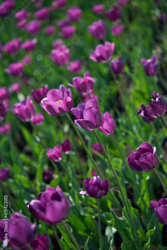 Fototapeta premium Purple tulip field, close-up. Purple tulips flowers
