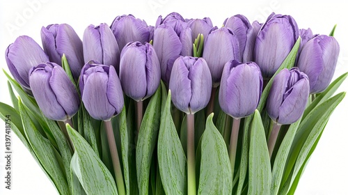 Fototapeta premium Purple tulips bouquet, spring flowers, white background, floral arrangement,...
