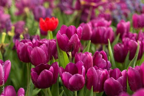 © Anna Babii, Obraz premium Purple tulips fild with one red flower. Spring background.
