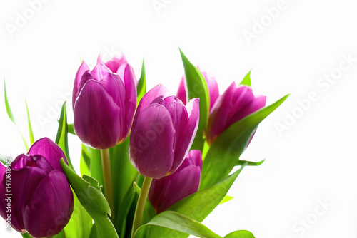 © balogh, Naklejka premium Purple tulips with green leaves on white background