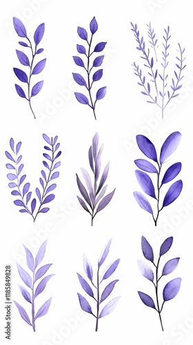 © Siasart, Naklejka premium Purple Watercolor Leaves Decorate Beautifully with Floral Elegance