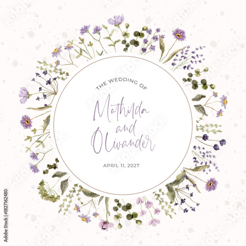 © wulano, Obraz premium purple wildflower watercolor round frame