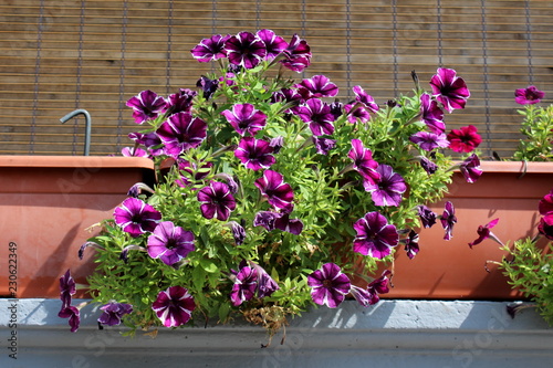 © hecos, Fototapeta premium Purple with white stripes fully open Petunia flowers surrounded with small green leaves growing from large flower pots on concrete balcony fence on warm sunny day