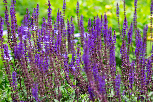 Naklejka premium Purpurowa szałwia leśna kwitnąca, Salvia nemorosa, clary bałkański lub Hain...