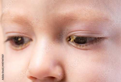 Fototapeta premium Pus in a little boy's eyes. Concept of bacterial and viral conjunctivitis in...