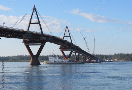 © Arc, Fototapeta premium Push tug sailing under the Deh Cho Bridge