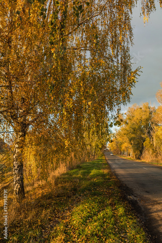 © Victoria Kondysenko, Obraz premium Pusta droga jesień wzdłuż pól złotej pszenicy ozimej o zachodzie słońca