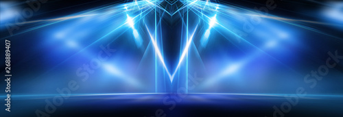 Obraz premium Pusta scena, niebieski neon, abstrakcyjne niebieskie tło. Promienie reflektorów, światło, abstrakcyjny tunel, korytarz.