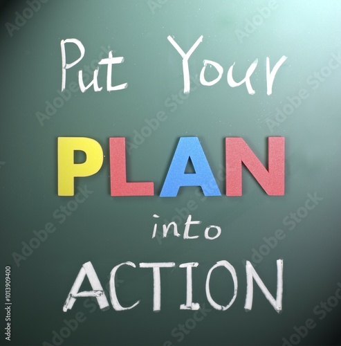 © Lawrence Lu/imageBROKER, Obraz premium Put your plan into action, words on blackboard