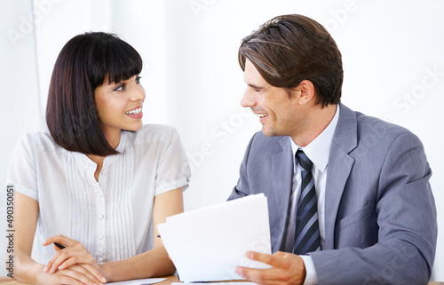 Fototapeta premium Putting their minds together to succeed. Two young executives enjoying a conversation in the office together.