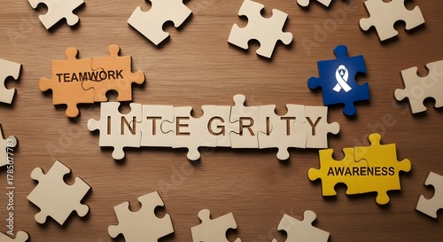 © Lugia Agung, Obraz premium Puzzle pieces forming the word Integrity on wood