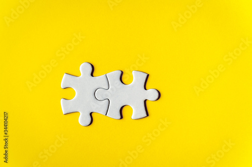Obraz premium Puzzle pieces on yellow background. Double piece flat puzzle. Business background. Copy space for text, top view.