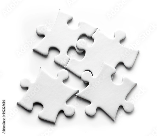 © Iswanto, Obraz premium Puzzle pieces scattered on the table with a clean white background, closeup detail.