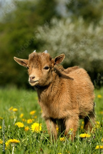 Fototapeta premium Pygmy domestic goat or Dwarf Goat, capra hircus, 3 Month old Young with Flowers