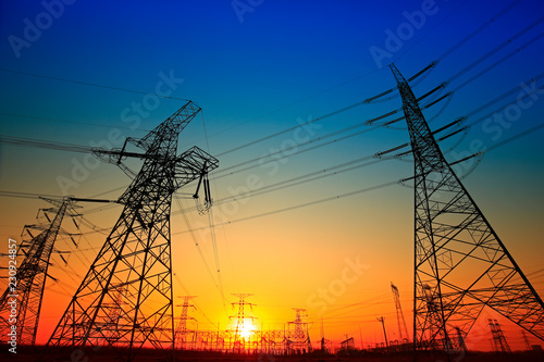 © pdm, Fototapeta premium Pylon, high-voltage tower sky background.
