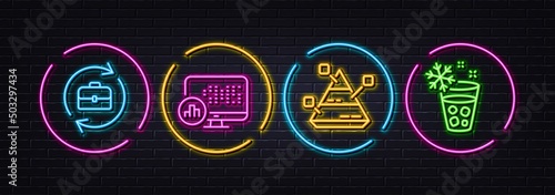 © blankstock, Naklejka premium Pyramid chart, Report statistics and Human resources minimal line icons. Neon laser 3d lights. Ice maker icons. For web, application, printing. Report analysis, Graph chart, Job recruitment. Vector