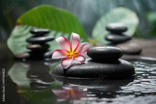 © Ilia, Obraz premium Pyramids of balanced zen pebble meditation stones with green leaves and flowers in water on tropical forest background. Concept of harmony, balance and meditation, spa, massage, relax and yoga.
