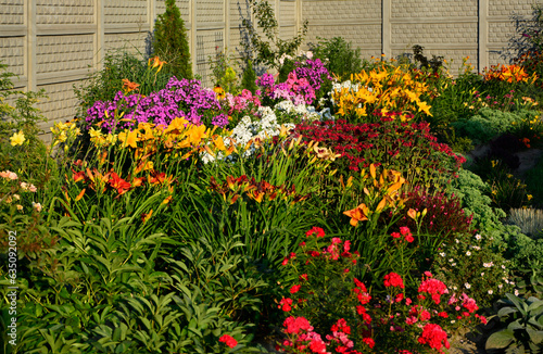 Naklejka premium Pysznogłówka szkarłatna, liliowce i floksy wiechowate w ogrodzie (Monarda didyma, Hemerocallis i Phlox paniculata), ogród kwiatowy, ogród z kwitnącymi byliami, colorful flower bed