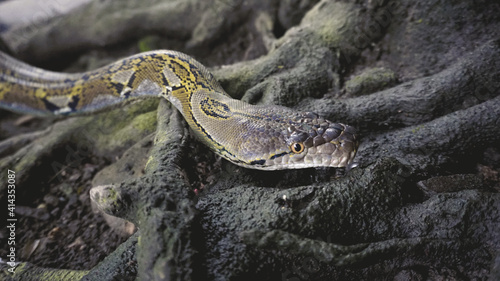 © bintank, Obraz premium Python Reticulatus Closeup Moving On The Root.