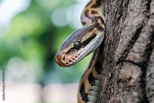 © AI_Imaginator, Obraz premium Python snake on tree trunk closeup