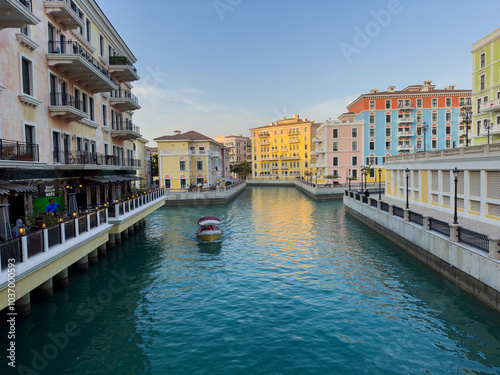© Salim, Naklejka premium Qanat Quartier on The Pearl Island in Qatar, which is characterized by brightly colored buildings, a lake in the middle, restaurants and shops, is one of the beautiful . Doha Qatar
