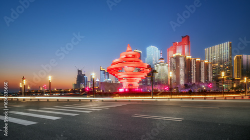 Fototapeta premium Qingdao May Fourth Square Evening View with Illuminated Landmark