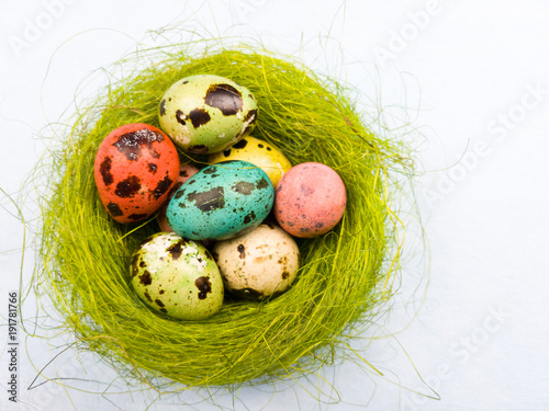 © Michael Sapryhin, Obraz premium Quail easter color eggs in nest on pastel blue backgroun. Close up.