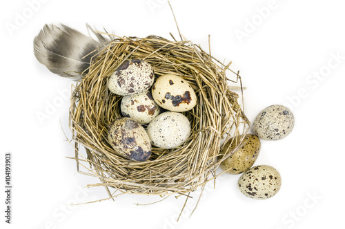 © nikolay53, Fototapeta premium Quail eggs and a nest of grass.