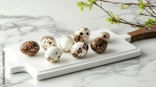 Obraz premium Quail eggs artfully arranged on a white cutting board alongside green branches, showcasing a natural setting and elegant simplicity.