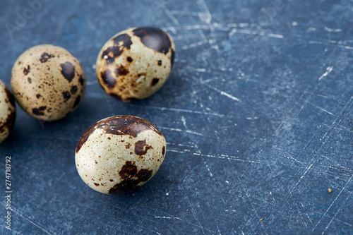 Obraz premium Quail eggs. Black background. Top view. Free space.