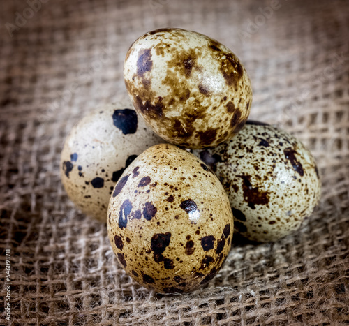 Fototapeta premium quail eggs close-up in a dark key