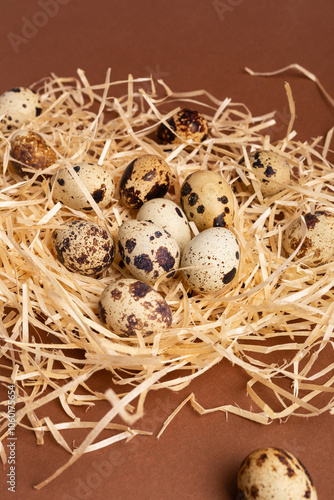 © Julia, Fototapeta premium Quail eggs from above on brown background. Beautiful composition with quail eggs.