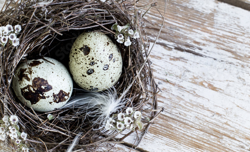© Marika, Obraz premium Quail eggs in a bird's nest on a wooden background.