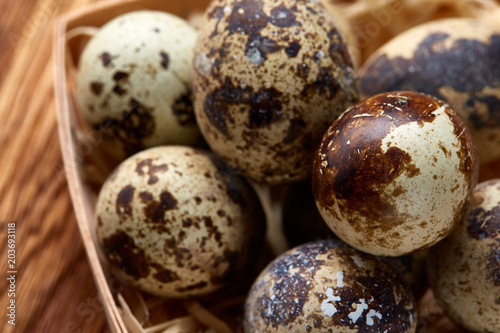 © Aleksey, Obraz premium Quail eggs in a box on a rustic wooden background, top view, selective focus.
