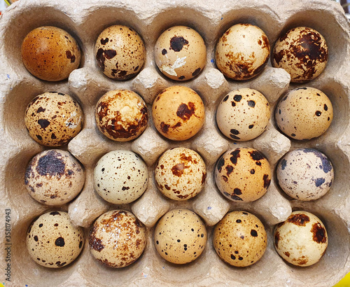 © Igor Pirozhkov, Fototapeta premium quail eggs in a cardboard container, 20 pieces