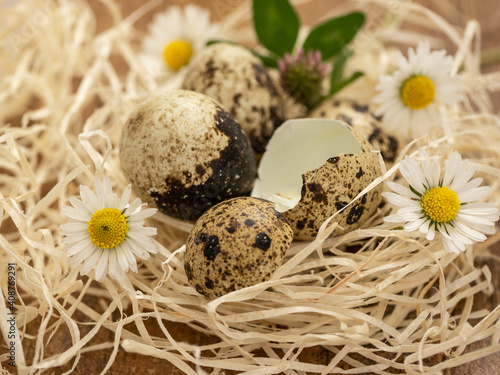Obraz premium Quail eggs in a nest and white flowers, daisies, decoration composition for...