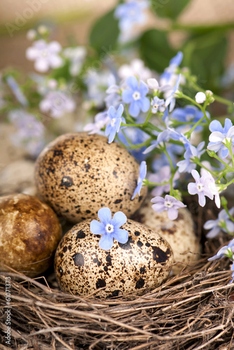Fototapeta premium Quail eggs in a nest, forget-me-nots closeup