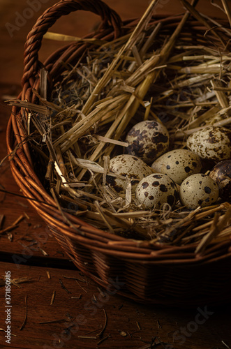 Obraz premium Quail eggs in a nest made of hay and wicker baskets.