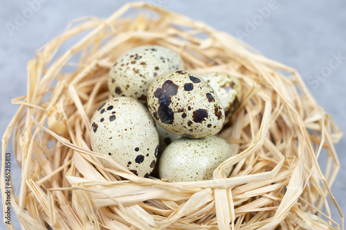 © Amo, Obraz premium Quail eggs in a nest of hay close-up