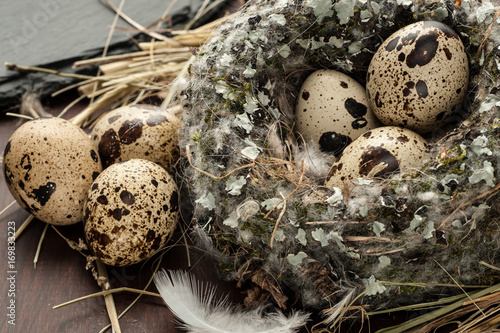 © photo-nuke, Obraz premium quail eggs in a nest over old wooden background close-up