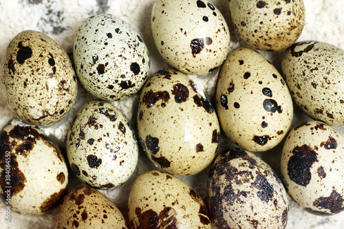Fototapeta premium quail eggs in flour, top view