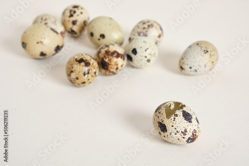 © Natasha, Obraz premium quail eggs in light texture background copy space