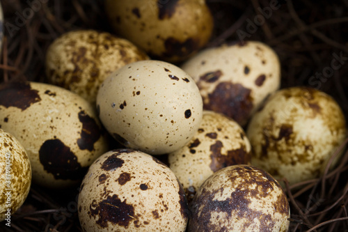 Obraz premium Quail eggs in nest of twigs close up . Dark light style