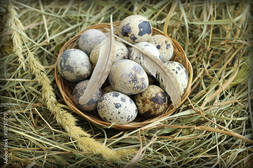 © andiafaith, Fototapeta premium Quail eggs in wicker basket, close-up
