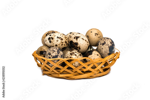 © Vastram, Obraz premium Quail eggs in wicker basket on white background
